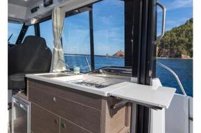 Deck: Electric windlass (with control from helm position), plus anchor and rode in self draining anchor locker + bow roller. Self draining cockpit. Aft cockpit sliding bench with cushions + folding bench on port side + extra bench box behind sliding door + table - forming U-shape cockpit saloon with sundeck cushion. Cockpit deck locker. Cockpit shower - hot & cold. Side gate for easy access to moorings. Barrier to swim platform with handrail and folding boarding ladder. Cockpit sun awning with aft closing canvas - graphite. Mooring kit - fenders and ropes. Hull rubrail. 2x forward / 2x aft / 2x midship mooring cleats + 2x forward chocks. Front sunpad with lounge chairs + open front pulpits + cockpit handrails. Fishing rod holders. Flexiteek to swim platforms, aft cockpit, starboard side deck, foredeck footwell.