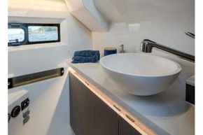Machinery: Twin Yamaha F250 XSB2 (white) outboard engines - Steer By Wire with joystick. Bow thruster for easier close quarter manoeuvrability. Zipwake automatic trim tabs for improved comfort. Hydraulic steering. Diesel forced air heating. Fuel capacity: 2x 300L - with outside fill. Water capacity: 160L.